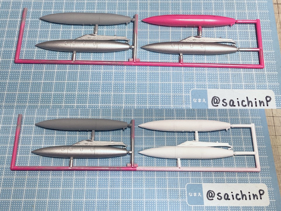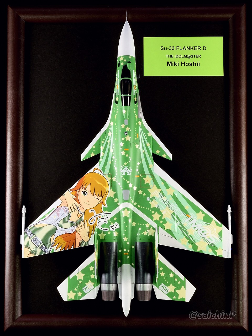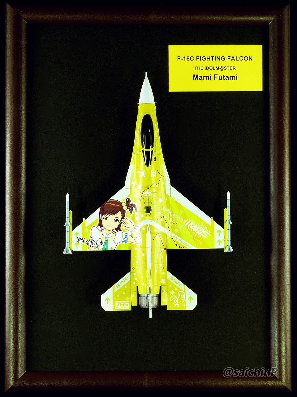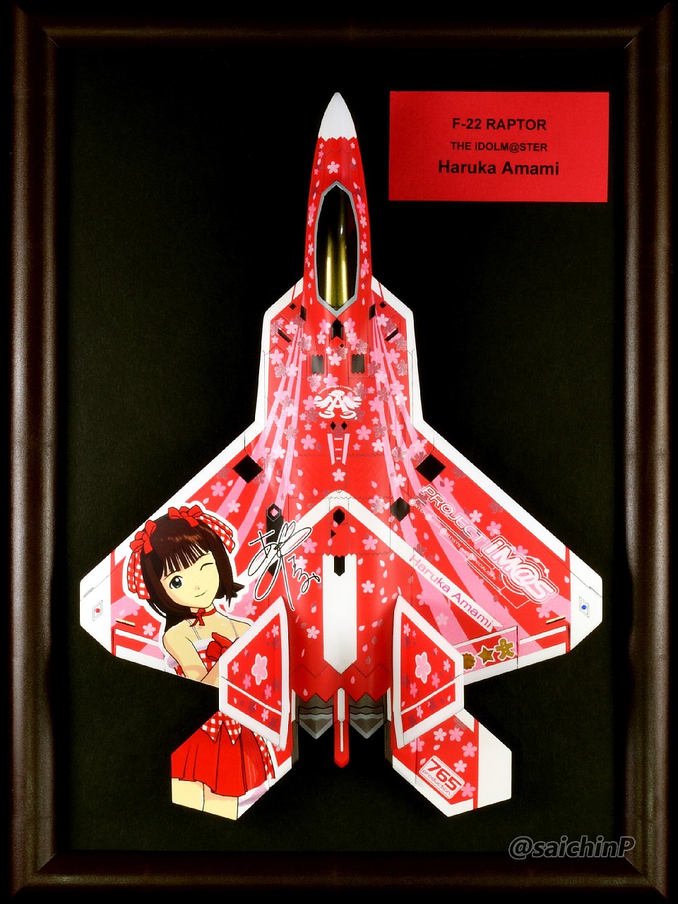 個別に額縁に取り付けて展示していた各機を専用の展示ケースを作りまとめて自宅の壁に固定しました。 自宅の壁にこれがドドンと飾られているのはなかなかのものです。 ケースは自作して壁にネジや釘で完全に固定しています。 一戸建ての持ち家なのでここまで趣味に走ってやることができました。 数機ならともかくアイマス機を全部作ったという人はそんなにいないと思いますのでその視点でまとめておきたいと思います。 ・額縁仕様について 前提としてアイマス機は主翼部の大きなアイドルイラストが要素の7割くらいを占めていると思っているので、それを一番見やすい状態で展示したいと考えていました。 そのために飛行状態で組む。だけど大抵のキットにはパイロットフィギュアがついていない。 なのでキャノピーはスモークグレーで黒塗りとしました。 これで、機体下面は作らない、脚とコックピットを省ける、となってかなりの省力化となりました。 外部搭載兵装類は基本的に省略でクリーンな状態、ただし翼端ランチャーは『下面ではない』ので省略せずにミサイルを搭載するように統一しました。 おかげで、WF参加の原型作業などに時間を取られつつも3年で全機完走できました。 ・塗装かデカールか アイマス機でデカールの透け防止に白で塗るのはある種定番的な作業です。 私は雪歩機は機体色が白に近いので白ラインはデカールを使用しました。デカールの透け防止の白塗装もなしです。 あとは亜美機の翼端はデカールで白帯を貼りました。 それ以外はすべてマスキングで白ライン等を塗装しています。 個人的には機体の縁に沿うような白ラインはデカールよりも塗装のほうが楽です。 ただしキラキラハの字は塗装では無理かなと思ったのでそのままデカールです。 あと、デカール貼りはヒートガンで熱して軟化させるのと、ハイキューパーツのデカールスキージーで押さえつけて密着させるのが最強かなと。 ソフターやセッターといったケミカル類はほとんど使っていません。 ・代替キット? 私が組んだのは発売当時に購入してそのまま押入れに十数年寝かしていた当時物です。 デカールの劣化は特に感じなかったですね、白ラインは割れやすい印象があります。 私は今回はポリシーとして当時のキットを使って作ることに決めていましたが、そう言うこだわりがなければ難易度ランキングで下の方にある手間がかかりそうなキットはその後に出た新金型の新キットを使用するのもありだと思います。 タイフーンなんかはハセガワ純正で新金型キットが出ましたからね。 ただし別キットにしたらデカールのサイズが合わない可能性があるのでその修正とどっちが楽かは私は未検証です。 ・成形色と染み上がり ハセガワ製と中身レベル製はアイドルのイメージカラーが成形色になっていて、中身がその他メーカー製のものは成形色がグレーです。 組む前に色つきのものはランナーを薄め液につけて確認しましたが染料が染み出したのはピンク色のF-22だけでした。 なのでF-22だけは対策として下地を銀サフとアクリジョンの白で塗っています。 検証用に春香F-22のランナーに塗って2025年2月から放置して観察しているのですが何もしてないサンプルも特に染み上がりは確認できません。 F-22の増槽のピンクランナーに クレオスグレーサフのみ ガイア銀サフのみ アクリジョンベースホワイトのみ 銀サフ+アクリジョンベースホワイト をそれぞれ吹いて、その上にクレオスGX1白を吹いて2025年2月1日から放置しています。 これが2025年4月21日の状態です。 特に変化なし。 これだと普通にグレーサフだけで良かったのかとなりますが…… ここからは各機のレビューですが記載順は作るのが楽で簡単な順です。カッコ内の数字は完成日(年.月)です 上ほど簡単で一番下が最難関です。(かなり個人的な主観で、なおかつ下面を作らない額縁固定での難易度です) F-117A 萩原雪歩 (2023.12) 特異な形状のステルス機故に、パーツが少なくてあっという間に形になり、パネルラインもほぼなしで複雑な曲面もない平面の組み合わせなのでとても作業がしやすいです。 さらに機体色が薄い青灰色なのでデールの下地を白で塗り分けずそのまま貼り付けています。 各部の白ラインも白塗装ではなく付属デカールで仕上げました。 関連:雪歩誕生日なのでF-117Aを作りました F-2A 双海亜美 (2023.5) 通常版とパールデカール版があります。 ハセガワスタンダードといった感じで癖のない作りやすいキットでした。 アイマス機としては初期に製品化されていたため、翼端の白帯デカールや亜美の肌色の色味など、こなれていない部分もありますが単体としてみると問題なしでしょう。 関連:亜美誕生日なのでF-2Aを作りました F/A-18F 秋月律子 (2022.6) 最初に作った物ですがこれも新しめのハセガワ製なので組むのは問題ないです。 ただこの後に出てくる機種もそうですが、双発機はどの機もエアインテーク周りの嵌合やすり合わせなどの調整