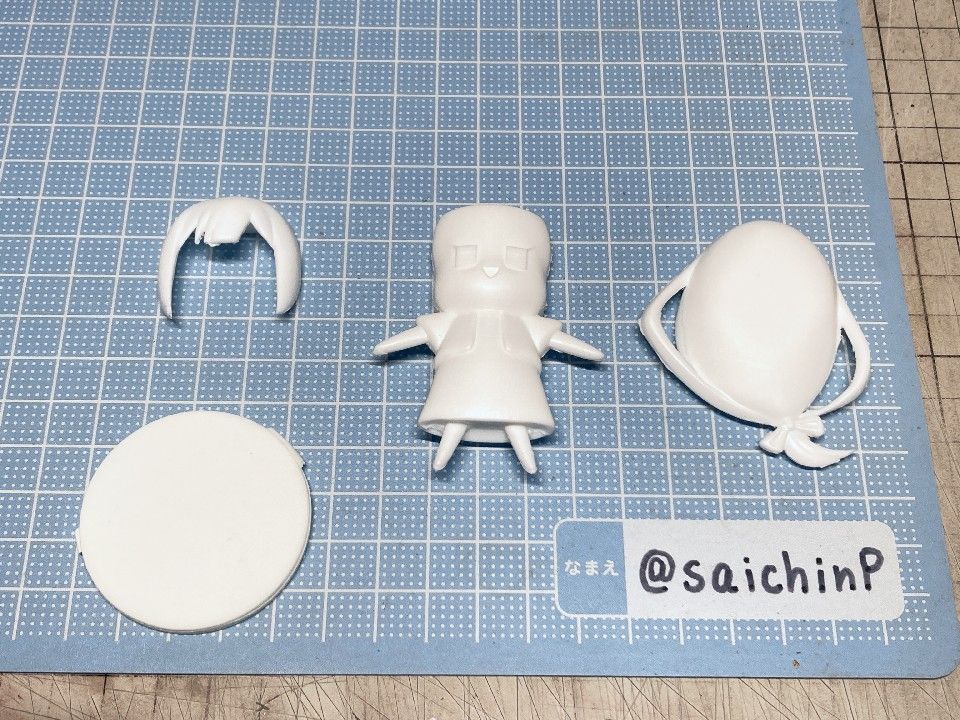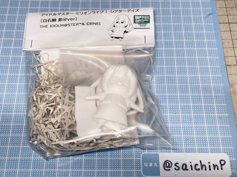 前回のWFで購入したディーラー『祈リサマ』さんのガレージキット『白石紬 節分ver』です。 パーツも少なくて価格もお手頃なので、WFで買ったキットを完成させる満足感が気軽に味わえます。 以前に私が作ったミリオンのマスコットたちとデフォルメ具合やサイズ感が合うので並べても楽しめました。 ここからは作業の様子。 キットはWF2025冬で購入したものです。 ベースは付属していないので自前で用意しました。 髪の裏側部分にネオジム磁石を埋め込みました。 冷蔵庫の扉に貼り付けたりもできます。 髪飾りのディテールを塗り分けのガイドを兼ねてプラ板で追加しました。 あとはもう普通のガレキです。 パーツ数も少ないのでお手軽に楽しめていいですね。 作業期間は1週間くらいでした。 各SNSにも投稿しているのでいいね支援等よろしくお願いします。