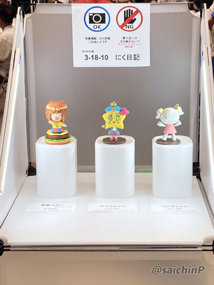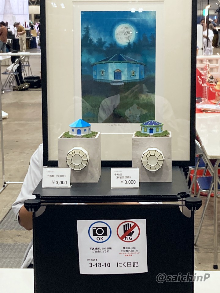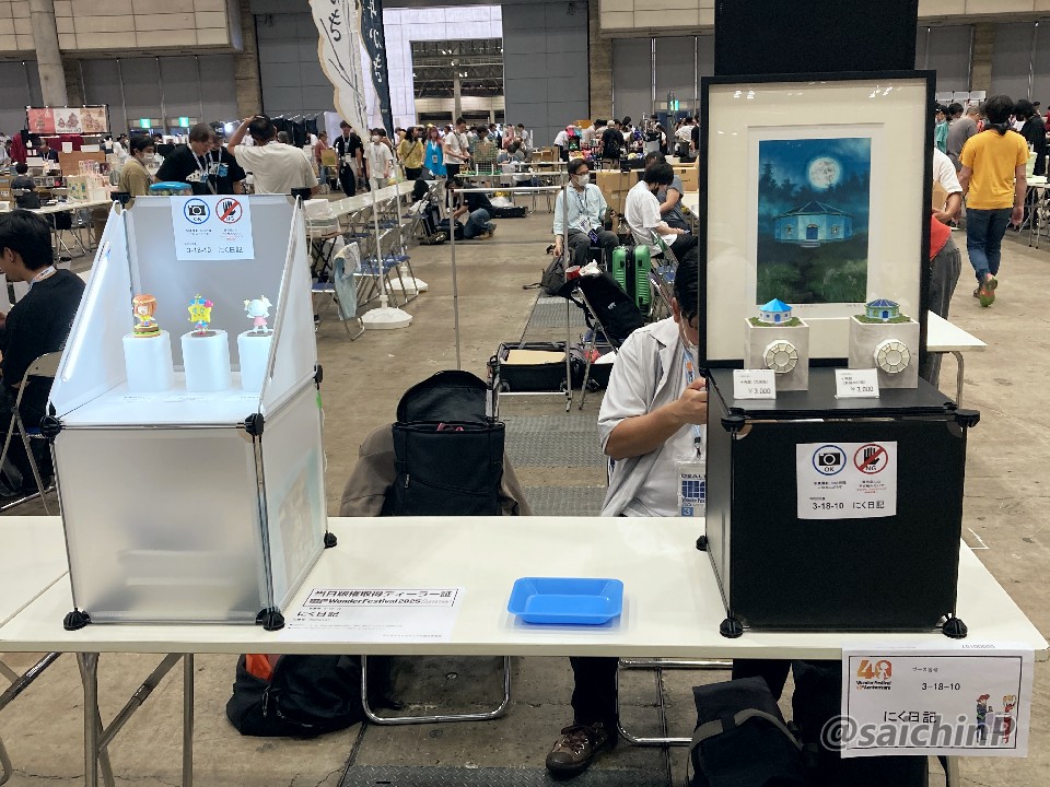 ディーラー名 にく日記 卓番 3-18-10 当日の卓の様子です。 卓に向かって左が私ので右がにく日記さんので、中央がお会計ゾーンです。 私の出し物は向かって左から 高槻やよい ハンバーガー Ver. はつみちゃん コムギちゃん 今回初めてLEDライトを持ち込んで照明を設置しました。 にく日記さんのは向かって左から 十角館(文庫版) 十角館(新装改訂版) 去年の夏のWFは過酷な暑さでしたが今年はそれよりは気温が低かったのと運営が暑さ対策に気を使ってくれていたのでなんとか無事に過ごせました。 凍らせたペットボトル6本と保冷剤と携帯扇風機、冷感タオルなど去年の経験を踏まえて暑さ対策装備も強化して望みました。 ペットボトル5本分2.5リットルをゴクゴクと飲みまくりました。 前回の冬のWFでかなり不満が出ていた入場の列さばきなども今回はスムーズでやれば出来るじゃない、という良い印象でした。 やよいとはつみちゃんは完売しました。ありがとうございました。 はつみちゃんを購入していく人が若い人が多くてやっぱり学マスは客層が違うなと実感しました。 若い人がガレキ作ってくれるのは嬉しいです。 それと、パーツチェックはお早めに。 卓を訪れてくれた皆様、差し入れまでしてくれた人もいて感謝です。 ツイッターで相互フォローの人とかは名乗ってくれれば名刺くらいは渡せますのでよろしくです。 ツイッター(X)でキットの購入報告や完成報告をする時は文中に「さいちんP」とか@saichinPと入れてくれると見に行ったりします。 次回、冬のワンフェスは2026年2月8日とのことです。 参加については詳細が出てからメンバーと話し合って決めるので続報をお待ち下さい。 関連 WF2025夏 告知【3-18-10】 WF2024夏 参加しました WF2025冬 一般参加しました PR |