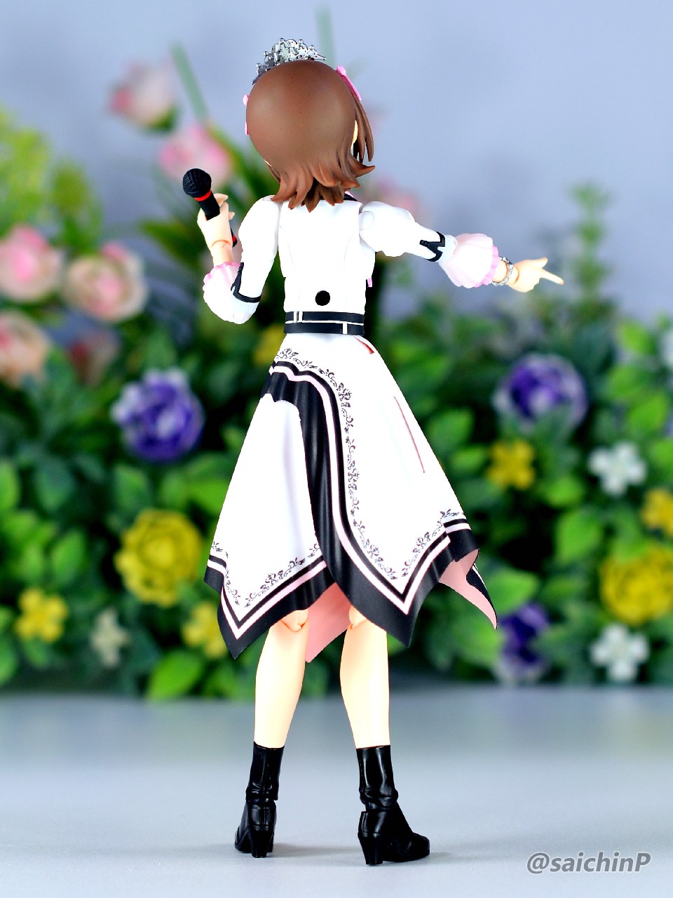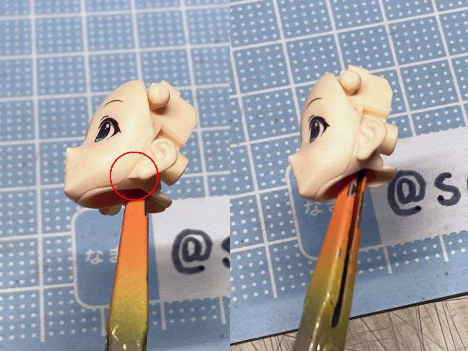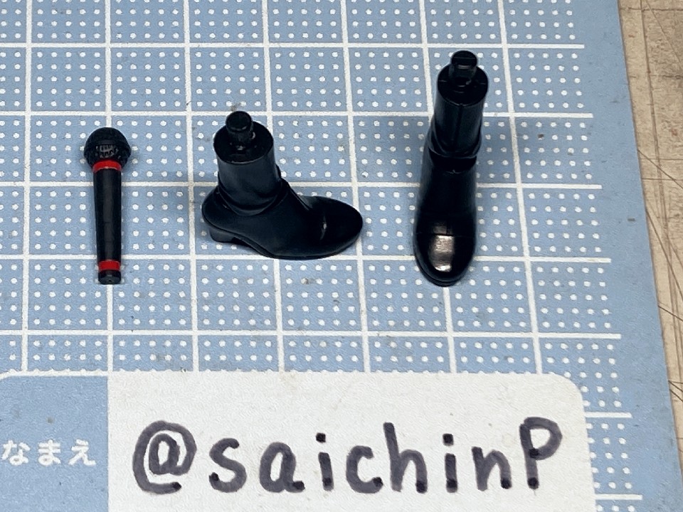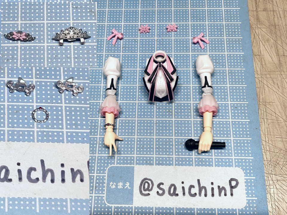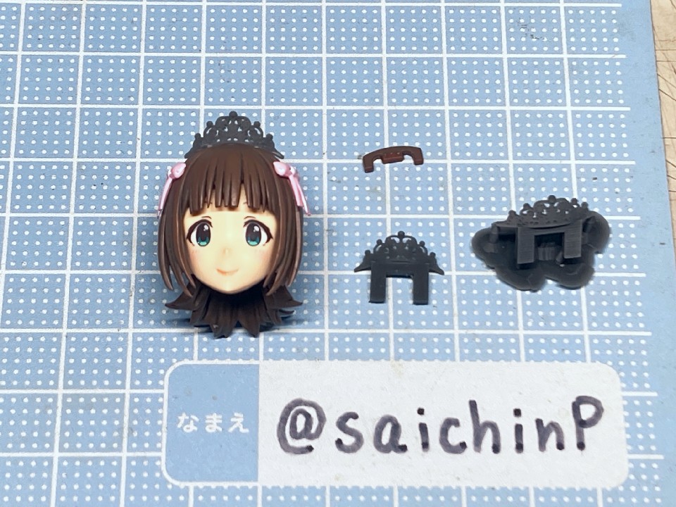 アイドルマスターの20周年記念として『YOU AND アイ!』の衣装で30MS化された春香です。 アイマスの30MSといえばシャニマスの全アイドルが製品化ということで現在もシリーズが進行中なので、まあ普通は765が今更プラモ化とかは無いだろうなと思っていただけに驚かされました。 20年経つとプラモ化されるということもあるんだねえと感慨深いです。 ちゃんと今風のシュッとしたデザインの天海春香が30MSのフォーマットでお手軽に出来上がります。 表情の差分や手のパーツも多数付属していてブンドド遊びも捗るでしょう。 今回は成形色を活かした部分塗装で仕上げたので、具体的に何をしたのかを順番に解説していきます。 自分の技量や持っているツール、環境に応じてやれそうなところをチャレンジしてみてください。 ↑この画像は拡大できます 上から順番に解説します。 いきなり今回の最高難易度のティアラです。 作業中にちょうど765ASのライブである『NEI』が開催されて、私も両日現地に行ったのですが、その2日目の演出に脳を焼かれてしまい、追加することにしました。 ZBrushというソフトでモデリングして、3Dプリンターで出力しました。 3Dモデルは拡大してみると結構適当なのですが、出力した実物は幅15mm程度のサイズなので精密にしすぎても折れるだけなのでデフォルメしてらしさが出れば満足です。 30MSの頭頂部のジョイントにはめ込めるようになっています。 髪の毛の合わせ目消しと塗装 後頭部の髪の毛は合わせ目がそこそこ目立つので、出来るならパテやら瞬間接着剤で埋めて、埋めたからには塗装することになります。 私は瞬間接着パテで埋めて塗装しました。 髪色はレッドブラウンとウッドブラウンを混ぜたチョコレートっぽい色を全体に吹いて、凹部にウェザリングカラーのグランドブラウンでスミ入れしました。 あと、毛先などに基本色より明るい茶色を吹いてハイライトにしています。 アクセサリー類の塗り分け 基本は成形色に従って銀とピンクで塗り分ければ見栄えが増すでしょう。 面積も小さいので筆でも塗りやすい。 髪に付けるアクセサリーのピンク部分は銀で塗り分ける部分があるので箱絵をよく見ましょう。 あと、ブレスレットはワンポイントでブランドイメージカラー(アイドルのイメージカラーではないので全員同色)の濃いピンクが入ります。 耳たぶの整形 耳たぶの下側付け根(赤丸部)に三角形の突起があるのでこれは削って整えました。 金型の都合で付くやつですね。 メイクとネイル 肌色は無塗装成形色仕上げですが、顔パーツの頬部分はタミヤのウェザリングマスター Hセットのピーチでチークを濃いめに強調しています。 あと、閉じ口の凹部分にラスキウスのクリアーペールレッドをスミ入れ的に流してリップとしています。 同様に耳の凹部や指の間の凹ぶにもクリアーペールレッドを流しています。 ネイル表現として指先にクリアーペールレッドを1滴乗せて薄く色を付けています。 服の塗り分け 襟のピンクはクリアーで透けるので上から塗りました。 胸元のリボンタイは裏側から削って薄くして、黒は成形色のままで縁のピンクはマスキングしてエアブラシで吹き付けています。 はみ出しとかがあったら爪楊枝やデザインナイフの刃先で削って整えます。 これは筆塗りでも同じですね。水性塗料で塗り分けてマジックリンではみ出しを落とす方法もあります。 肘や袖がクリアーパーツで特に肘が透けすぎていると感じたので白とピンクでそれぞれ薄く吹き付けて透け感を軽減しました。 あと、胴体と肩部分は前後の貼り合わせ部で合わせ目が出るので接着して合わせ目消しの処理をしました。 ベルト部分 上下に二本あるベルトの黒は無塗装で間を彫り込んでから白で塗りました。 ベルトループは元のモールドを削り取ってから白いプラペーパーの細切れに置き換えています。 塗り分けるよりはシャープに仕上がりますが面倒なら塗り分けでもよいでしょう。 バックル部分は銀で筆塗りしています。 そして、服の凹モールドとボタンの周辺に薄いグレーでスミ入れをしてディテールを強調しています。 スカート スカートの切り口部分は毛羽立ちが気になるので紙やすりで軽く磨いてから黒帯がある部分は縁(赤線部分)を油性の黒マジックで塗っています。 マイクとブーツ マイクはアイドルのイメージカラー(春香なので赤)の帯を二本、モールドに沿って塗りました。 これはミリシタのカードイラストを参考にしていますが、リアルのライブでもキャストさんが識別用に色違いの印をマイクに付けていたりするので観察してみてください。 ブーツは足裏に穴を開けてネオジム磁石を仕込みました。 これで背中に支えの棒がなくても鉄板の上でなら安定して片足立ちさせることができます。 また、ブーツは服の黒部分との質感の差を出すためにセミグロスブラックで塗装しました。 以上で追加工作などは終わりです。 無理せずに自分の出来そうな物を選んでチャレ
