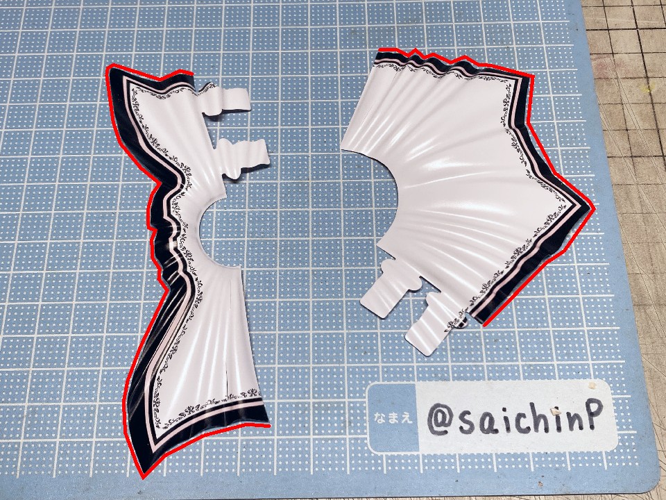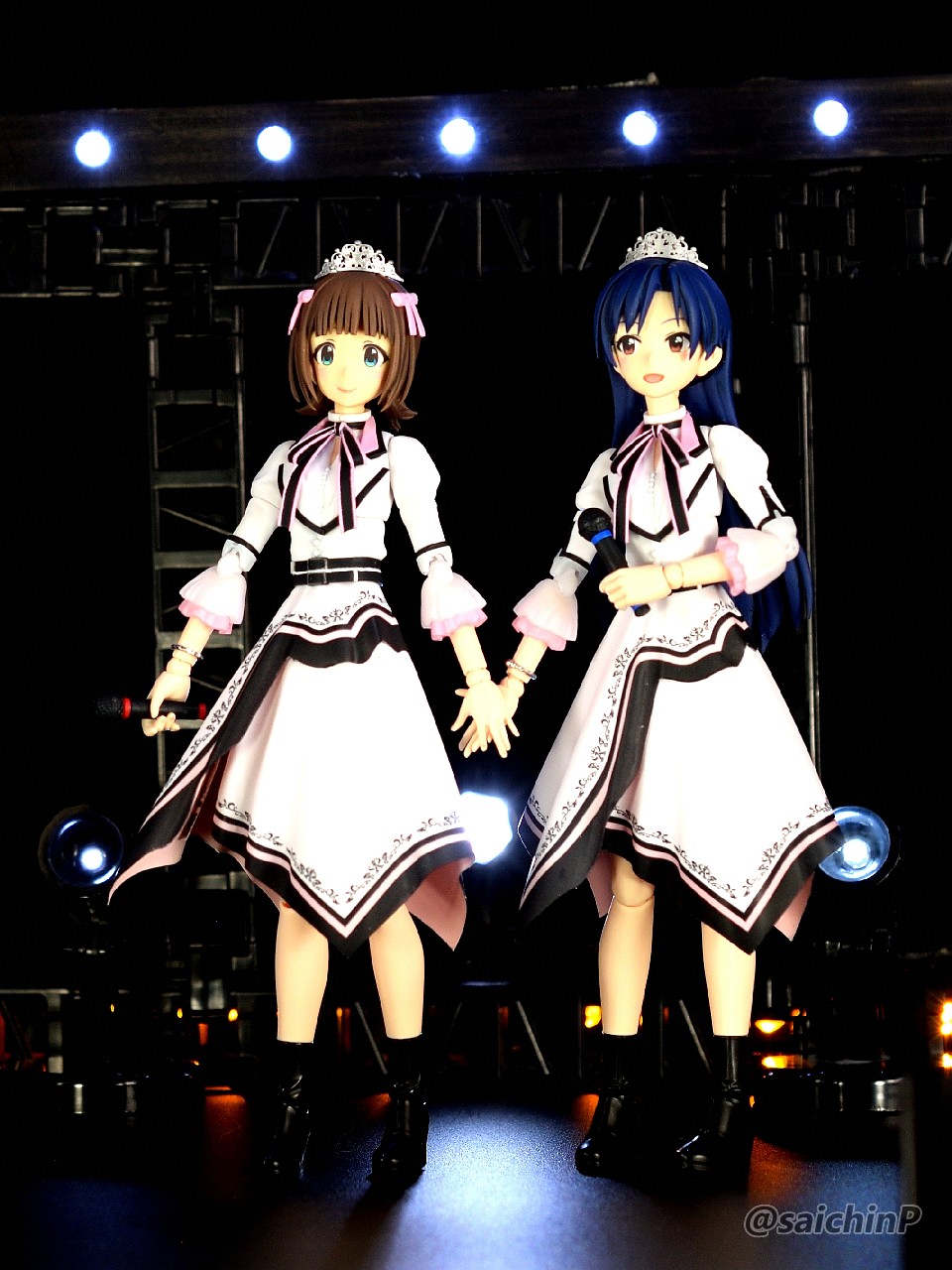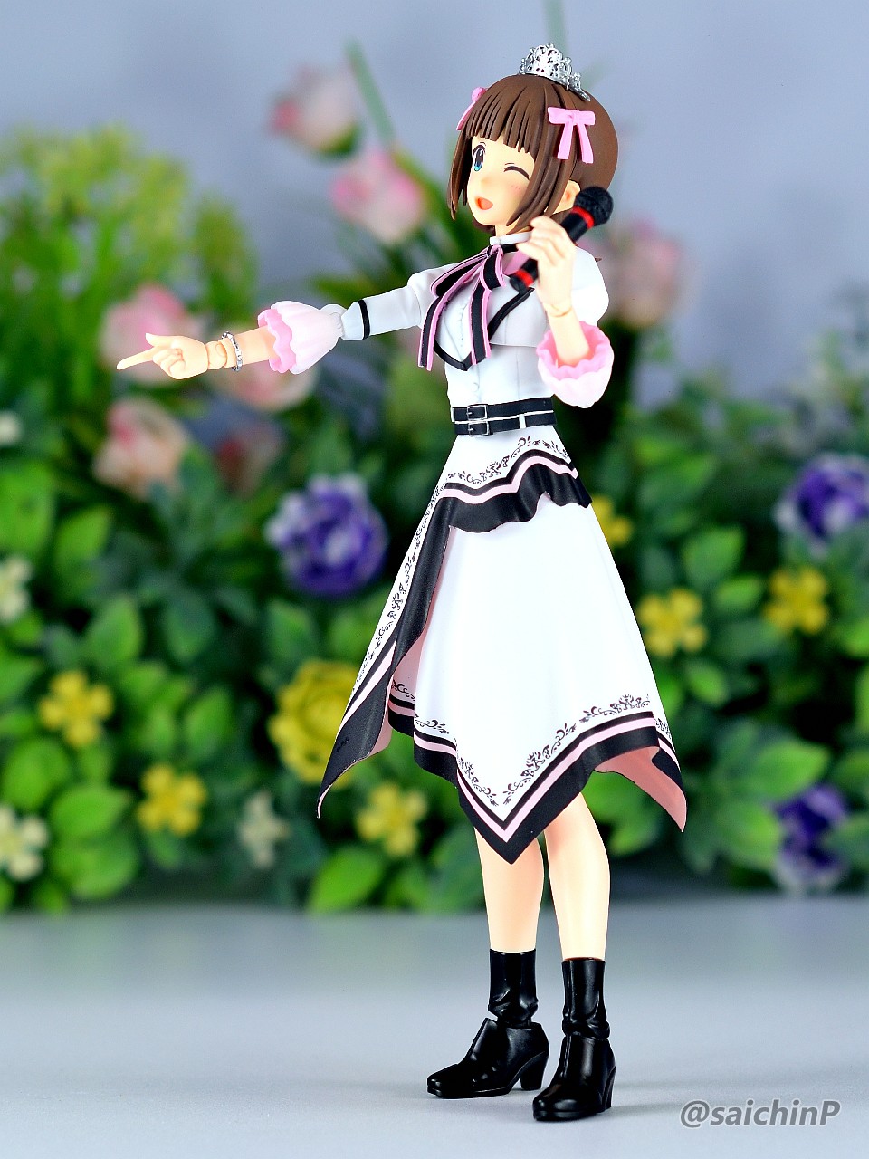 アイドルマスターの20周年記念として『YOU AND アイ!』の衣装で30MS化された春香です。 アイマスの30MSといえばシャニマスの全アイドルが製品化ということで現在もシリーズが進行中なので、まあ普通は765が今更プラモ化とかは無いだろうなと思っていただけに驚かされました。 20年経つとプラモ化されるということもあるんだねえと感慨深いです。 ちゃんと今風のシュッとしたデザインの天海春香が30MSのフォーマットでお手軽に出来上がります。 表情の差分や手のパーツも多数付属していてブンドド遊びも捗るでしょう。 今回は成形色を活かした部分塗装で仕上げたので、具体的に何をしたのかを順番に解説していきます。 自分の技量や持っているツール、環境に応じてやれそうなところをチャレンジしてみてください。 ↑この画像は拡大できます 上から順番に解説します。 いきなり今回の最高難易度のティアラです。 作業中にちょうど765ASのライブである『NEI』が開催されて、私も両日現地に行ったのですが、その2日目の演出に脳を焼かれてしまい、追加することにしました。 ZBrushというソフトでモデリングして、3Dプリンターで出力しました。 3Dモデルは拡大してみると結構適当なのですが、出力した実物は幅15mm程度のサイズなので精密にしすぎても折れるだけなのでデフォルメしてらしさが出れば満足です。 30MSの頭頂部のジョイントにはめ込めるようになっています。 髪の毛の合わせ目消しと塗装 後頭部の髪の毛は合わせ目がそこそこ目立つので、出来るならパテやら瞬間接着剤で埋めて、埋めたからには塗装することになります。 私は瞬間接着パテで埋めて塗装しました。 髪色はレッドブラウンとウッドブラウンを混ぜたチョコレートっぽい色を全体に吹いて、凹部にウェザリングカラーのグランドブラウンでスミ入れしました。 あと、毛先などに基本色より明るい茶色を吹いてハイライトにしています。 アクセサリー類の塗り分け 基本は成形色に従って銀とピンクで塗り分ければ見栄えが増すでしょう。 面積も小さいので筆でも塗りやすい。 髪に付けるアクセサリーのピンク部分は銀で塗り分ける部分があるので箱絵をよく見ましょう。 あと、ブレスレットはワンポイントでブランドイメージカラー(アイドルのイメージカラーではないので全員同色)の濃いピンクが入ります。 耳たぶの整形 耳たぶの下側付け根(赤丸部)に三角形の突起があるのでこれは削って整えました。 金型の都合で付くやつですね。 メイクとネイル 肌色は無塗装成形色仕上げですが、顔パーツの頬部分はタミヤのウェザリングマスター Hセットのピーチでチークを濃いめに強調しています。 あと、閉じ口の凹部分にラスキウスのクリアーペールレッドをスミ入れ的に流してリップとしています。 同様に耳の凹部や指の間の凹ぶにもクリアーペールレッドを流しています。 ネイル表現として指先にクリアーペールレッドを1滴乗せて薄く色を付けています。 服の塗り分け 襟のピンクはクリアーで透けるので上から塗りました。 胸元のリボンタイは裏側から削って薄くして、黒は成形色のままで縁のピンクはマスキングしてエアブラシで吹き付けています。 はみ出しとかがあったら爪楊枝やデザインナイフの刃先で削って整えます。 これは筆塗りでも同じですね。水性塗料で塗り分けてマジックリンではみ出しを落とす方法もあります。 肘や袖がクリアーパーツで特に肘が透けすぎていると感じたので白とピンクでそれぞれ薄く吹き付けて透け感を軽減しました。 あと、胴体と肩部分は前後の貼り合わせ部で合わせ目が出るので接着して合わせ目消しの処理をしました。 ベルト部分 上下に二本あるベルトの黒は無塗装で間を彫り込んでから白で塗りました。 ベルトループは元のモールドを削り取ってから白いプラペーパーの細切れに置き換えています。 塗り分けるよりはシャープに仕上がりますが面倒なら塗り分けでもよいでしょう。 バックル部分は銀で筆塗りしています。 そして、服の凹モールドとボタンの周辺に薄いグレーでスミ入れをしてディテールを強調しています。 スカート スカートの切り口部分は毛羽立ちが気になるので紙やすりで軽く磨いてから黒帯がある部分は縁(赤線部分)を油性の黒マジックで塗っています。 マイクとブーツ マイクはアイドルのイメージカラー(春香なので赤)の帯を二本、モールドに沿って塗りました。 これはミリシタのカードイラストを参考にしていますが、リアルのライブでもキャストさんが識別用に色違いの印をマイクに付けていたりするので観察してみてください。 ブーツは足裏に穴を開けてネオジム磁石を仕込みました。 これで背中に支えの棒がなくても鉄板の上でなら安定して片足立ちさせることができます。 また、ブーツは服の黒部分との質感の差を出すためにセミグロスブラックで塗装しました。 以上で追加工作などは終わりです。 無理せずに自分の出来そうな物を選んでチャレ