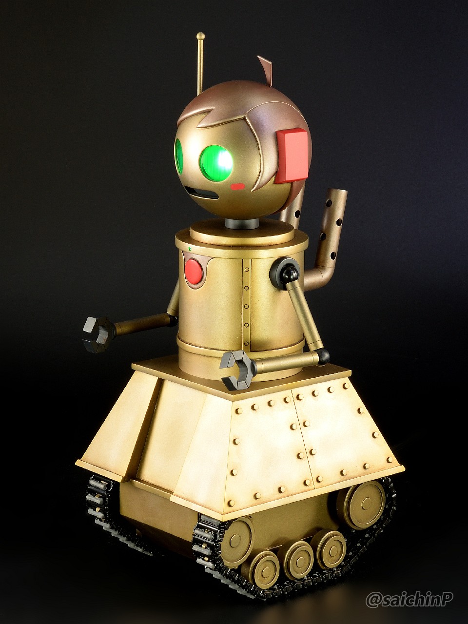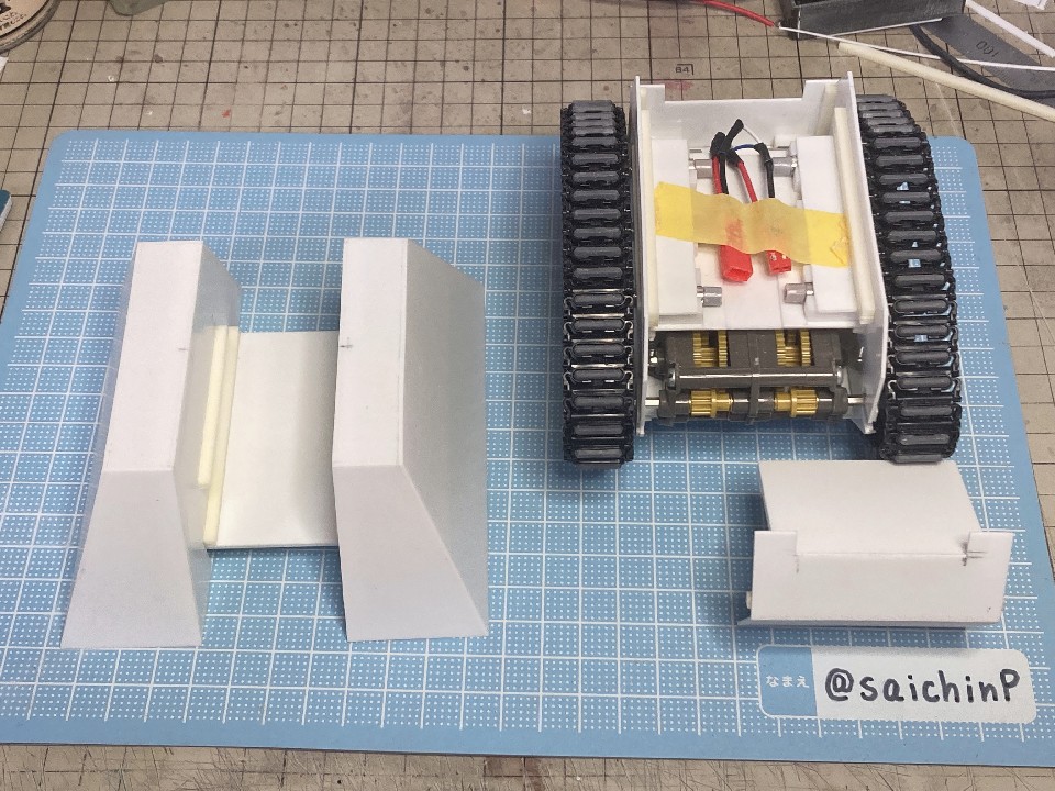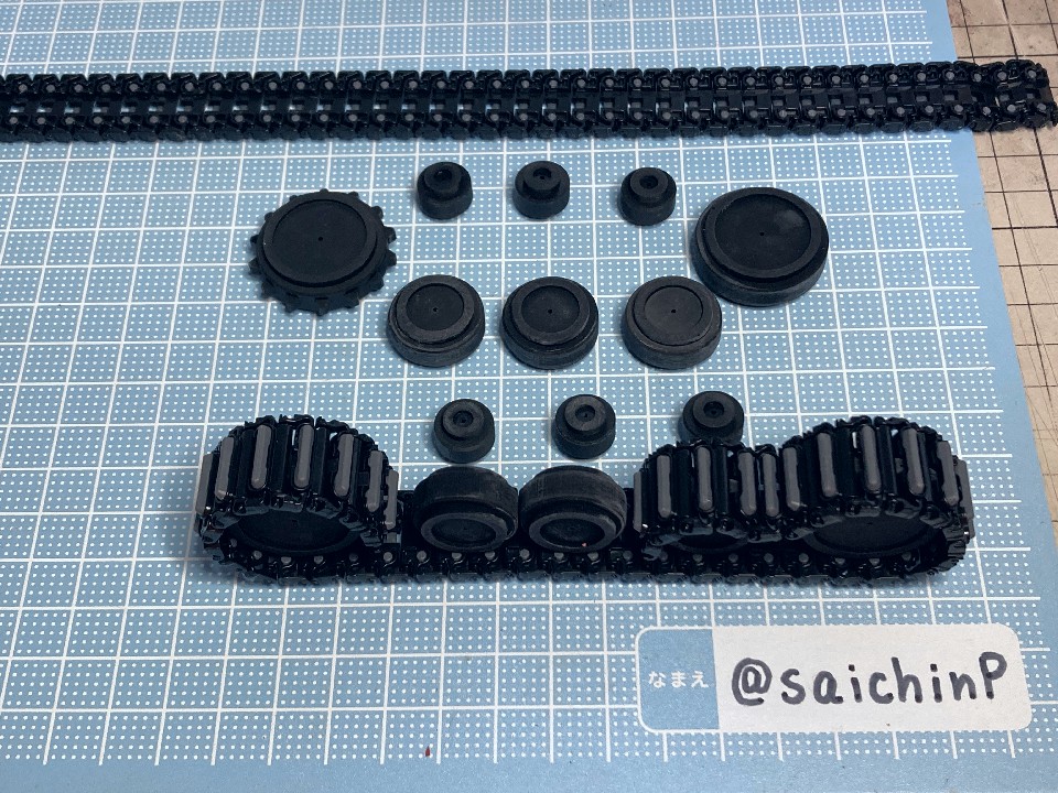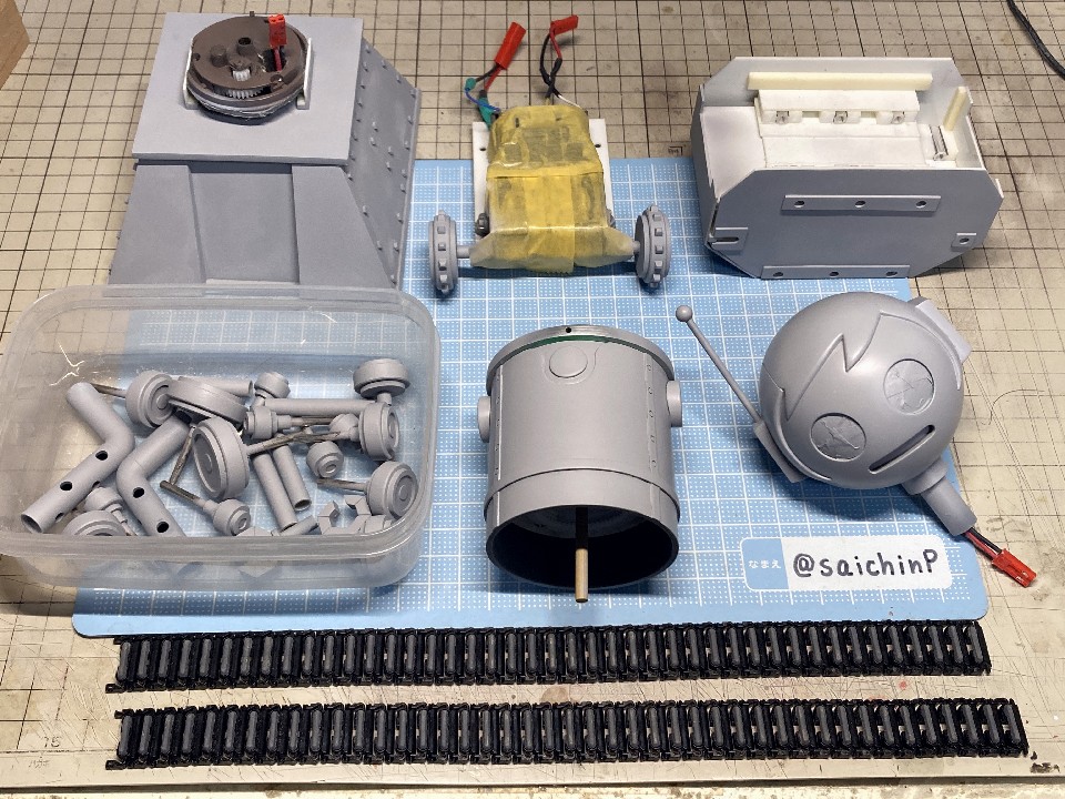 6月に作品の募集があったので私はこの『ひなたロボ』で応募してみました。 埋め込んだ投稿内の動画も見てください。 完成した『ひなたロボ』の画像がこれらになります。 モーター内臓の3chラジコンで走行と上半身の旋回ができます。 基本スペックは全高25cm、重量600g(電池込み) そして2ヶ月後の8月、アートコンテストの結果が発表されまして、この『ひなたロボ』が特別賞をいただきました。 アートコンテスト入賞作品公開 - ミリシタ8周年特設サイトより 入賞の記念にミリシタ8周年のタペストリーをいただきました。 2007年に初めてやよいピンキーを作ってからアイマス関係のあれこれを18年作ってきて、公式のコンテストで受賞できたのはとても光栄で嬉しかったです。 ここからは『ひなたロボ』の制作工程を書いていきます。 『ひなたロボ』というのはミリシタの『無邪気なメカニック 萩原雪歩』のカードにいるロボで、正式名称はわかりませんがスチームパンクの世界観で見た目が木下ひなたちゃんに似ているロボットです、なので界隈ではだいたい『ひなたロボ』と呼ばれているようです。 作業開始は2023年9月で、これは前年の2022年の年末に最初のアートコンテストが行われたので、第2回があるなら2023年の年末だろうから、それに向けて早めに作り始めておこうという見切り発車的な計画でした。 『ひなたロボ』としたのは私がミリシタのシアター組の中ではひなたが好きなのと、普段からチュパカブラとかでんでんむすくんみたいなネタ寄りな物を作るのが好きなのと、コンテストである以上は入賞を意識して、そのためには動いて光ってそれを動画で公開するくらい派手にしないと埋もれるだろうなという読みからでした。 そんな感じでラジコンで動く『ひなたロボ』の制作が始まります。 最初にベースとなるラジコンユニットの調達です。 京商のRCミニタンク90式戦車、特売で新品900円で投げ売りされていたのを購入。 走行と砲塔旋回、主砲発射ギミック(発光と発射音)が付いてこれは安すぎ。 分解して内部を覗いてみると、履帯はゴムで長さの調節ができないのとギヤボックスはシャーシと一体なので使用不可。 RCのコントロール基板と砲塔旋回機構、電池ボックス、それとプロポを流用して組み込むことにしました。 履帯はタミヤの『連結式クローラー&スプロケットセット』を使用。 楽しい工作シリーズが懐かしすぎです。 ただしスプロケットはプラの材質が塗装不可なのとサイズの都合で要自作です。 ギヤボックスはタミヤの『ツインモーターギヤボックス』を使用。 これのサイズにより車体幅が決まります。 転輪類はデジタルモデリングして3Dプリンターで出力。 履帯は42枚連結したものを2本作りました。 フローリングの床でもすべらないゴムパッド付きです。 車体はプラ板の箱組み。 基板類を仮置きしての走行テストは良好なのでボディーを組んでいきます。 車体幅と履帯の幅はいじれないのでフェンダーをオーバーサイズにすることでプロポーションを元イラストに寄せるように調整をしています。 元のRC戦車の砲塔旋回機構を移植して上半身を旋回できるようにしました。 頭部は3Dプリンターで出力。 上半身は外径60mmのVU塩ビパイプで、この写真ではバランス調整前なので胴長です。 胴体の長さを調節して3Dプリンター出力した排気管を追加。 腕は市販の外径6.5mmプラパイプとボールジョイントを加工。 ハンドパーツやボルトのディテールは3Dプリンター出力で追加。 頭部の電飾は百均のLEDを分解して使用。 目のレンズカバーは市販の透明スプーンを加工。 そのままだと緑が薄かったのでクリアーグリーンを塗りました。 レンズ内部の縦線モールドもプラ板で追加しましたがわかりにくいかも。 髪の毛モールドはエポパテを薄盛りで耳は3Dプリント製。 あと、胸元にも小さなLEDを仕込んでいて発光します。 この辺まで作業したところで、コンテストの告知が出ました。 ところがなんと、イラストのみのコンテストだったので失意のまま作業中止。 計画は凍結となったのでした。 それから、塩漬け状態で1年半放置されていたのですが、2025年の5月29日にアートコンテストが告知されて作業再開です。 造形作業はほとんど終わっていたのでアンテナを追加して細かい修正をしました。 耳のアンテナはRC用の機能はなくてただのプラ棒です。 全パーツを組んでサイズ比較用のキューポッシュひなたちゃんと。 塗装は黒下地にブルーゴールドやカッパーを吹き重ねてスチームパンクらしい真鍮や銅のイメージで。 ウェザリングカラーで軽く汚したりして完成です。 プラ板、パテに3DプリントでのフルスクラッチでモーターライズとRC組み込み、さらには電飾までと模型の総合力を試される制作でしたが完成させることができてよかったです。 また次回アートコンテストがあるなら参加したいですね。 関連 ミリシタアートコンテストに参加してみた ミリシタアートコンテスト その後 アイマス