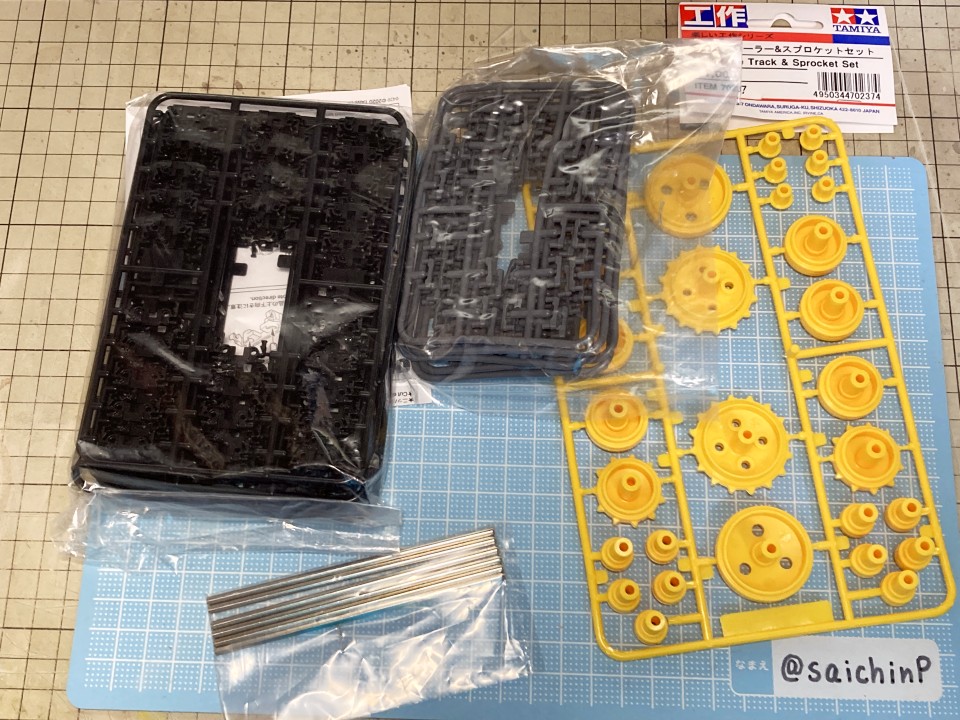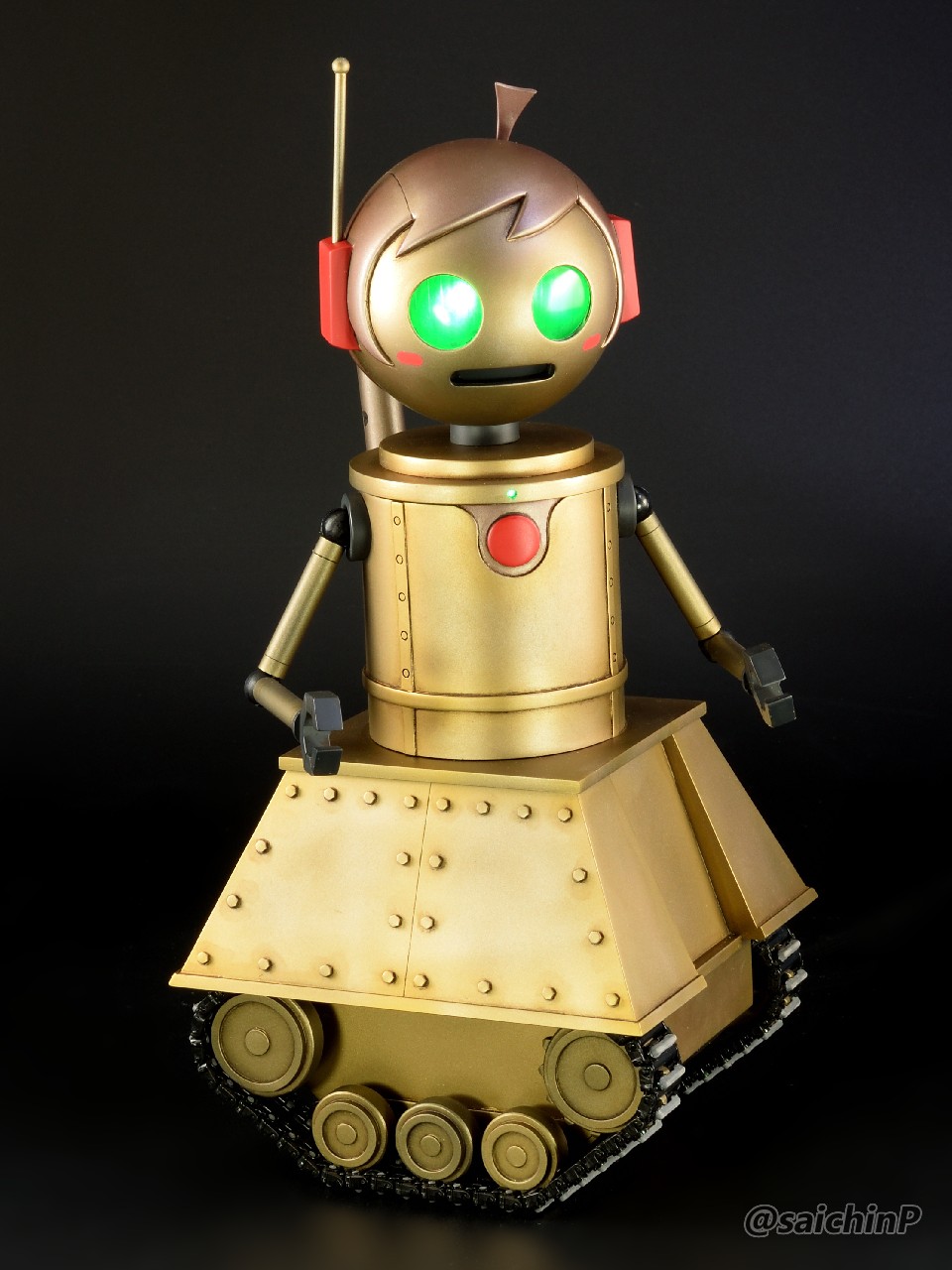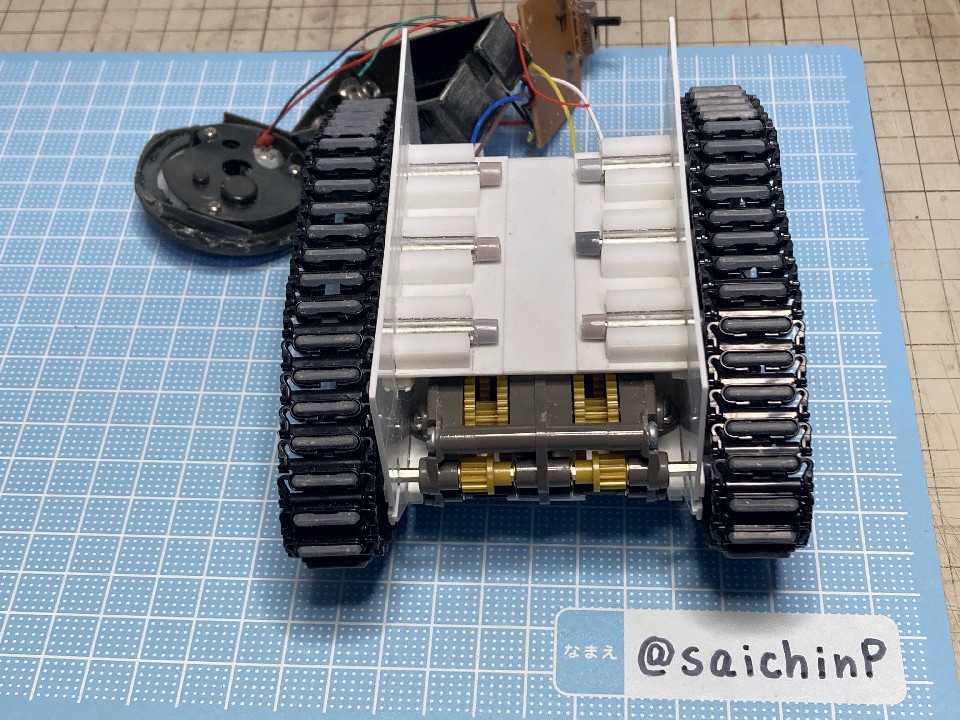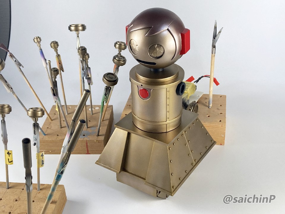 6月に作品の募集があったので私はこの『ひなたロボ』で応募してみました。 埋め込んだ投稿内の動画も見てください。 完成した『ひなたロボ』の画像がこれらになります。 モーター内臓の3chラジコンで走行と上半身の旋回ができます。 基本スペックは全高25cm、重量600g(電池込み) そして2ヶ月後の8月、アートコンテストの結果が発表されまして、この『ひなたロボ』が特別賞をいただきました。 アートコンテスト入賞作品公開 - ミリシタ8周年特設サイトより 入賞の記念にミリシタ8周年のタペストリーをいただきました。 2007年に初めてやよいピンキーを作ってからアイマス関係のあれこれを18年作ってきて、公式のコンテストで受賞できたのはとても光栄で嬉しかったです。 ここからは『ひなたロボ』の制作工程を書いていきます。 『ひなたロボ』というのはミリシタの『無邪気なメカニック 萩原雪歩』のカードにいるロボで、正式名称はわかりませんがスチームパンクの世界観で見た目が木下ひなたちゃんに似ているロボットです、なので界隈ではだいたい『ひなたロボ』と呼ばれているようです。 作業開始は2023年9月で、これは前年の2022年の年末に最初のアートコンテストが行われたので、第2回があるなら2023年の年末だろうから、それに向けて早めに作り始めておこうという見切り発車的な計画でした。 『ひなたロボ』としたのは私がミリシタのシアター組の中ではひなたが好きなのと、普段からチュパカブラとかでんでんむすくんみたいなネタ寄りな物を作るのが好きなのと、コンテストである以上は入賞を意識して、そのためには動いて光ってそれを動画で公開するくらい派手にしないと埋もれるだろうなという読みからでした。 そんな感じでラジコンで動く『ひなたロボ』の制作が始まります。 最初にベースとなるラジコンユニットの調達です。 京商のRCミニタンク90式戦車、特売で新品900円で投げ売りされていたのを購入。 走行と砲塔旋回、主砲発射ギミック(発光と発射音)が付いてこれは安すぎ。 分解して内部を覗いてみると、履帯はゴムで長さの調節ができないのとギヤボックスはシャーシと一体なので使用不可。 RCのコントロール基板と砲塔旋回機構、電池ボックス、それとプロポを流用して組み込むことにしました。 履帯はタミヤの『連結式クローラー&スプロケットセット』を使用。 楽しい工作シリーズが懐かしすぎです。 ただしスプロケットはプラの材質が塗装不可なのとサイズの都合で要自作です。 ギヤボックスはタミヤの『ツインモーターギヤボックス』を使用。 これのサイズにより車体幅が決まります。 転輪類はデジタルモデリングして3Dプリンターで出力。 履帯は42枚連結したものを2本作りました。 フローリングの床でもすべらないゴムパッド付きです。 車体はプラ板の箱組み。 基板類を仮置きしての走行テストは良好なのでボディーを組んでいきます。 車体幅と履帯の幅はいじれないのでフェンダーをオーバーサイズにすることでプロポーションを元イラストに寄せるように調整をしています。 元のRC戦車の砲塔旋回機構を移植して上半身を旋回できるようにしました。 頭部は3Dプリンターで出力。 上半身は外径60mmのVU塩ビパイプで、この写真ではバランス調整前なので胴長です。 胴体の長さを調節して3Dプリンター出力した排気管を追加。 腕は市販の外径6.5mmプラパイプとボールジョイントを加工。 ハンドパーツやボルトのディテールは3Dプリンター出力で追加。 頭部の電飾は百均のLEDを分解して使用。 目のレンズカバーは市販の透明スプーンを加工。 そのままだと緑が薄かったのでクリアーグリーンを塗りました。 レンズ内部の縦線モールドもプラ板で追加しましたがわかりにくいかも。 髪の毛モールドはエポパテを薄盛りで耳は3Dプリント製。 あと、胸元にも小さなLEDを仕込んでいて発光します。 この辺まで作業したところで、コンテストの告知が出ました。 ところがなんと、イラストのみのコンテストだったので失意のまま作業中止。 計画は凍結となったのでした。 それから、塩漬け状態で1年半放置されていたのですが、2025年の5月29日にアートコンテストが告知されて作業再開です。 造形作業はほとんど終わっていたのでアンテナを追加して細かい修正をしました。 耳のアンテナはRC用の機能はなくてただのプラ棒です。 全パーツを組んでサイズ比較用のキューポッシュひなたちゃんと。 塗装は黒下地にブルーゴールドやカッパーを吹き重ねてスチームパンクらしい真鍮や銅のイメージで。 ウェザリングカラーで軽く汚したりして完成です。 プラ板、パテに3DプリントでのフルスクラッチでモーターライズとRC組み込み、さらには電飾までと模型の総合力を試される制作でしたが完成させることができてよかったです。 また次回アートコンテストがあるなら参加したいですね。 関連 ミリシタアートコンテストに参加してみた ミリシタアートコンテスト その後 アイマス