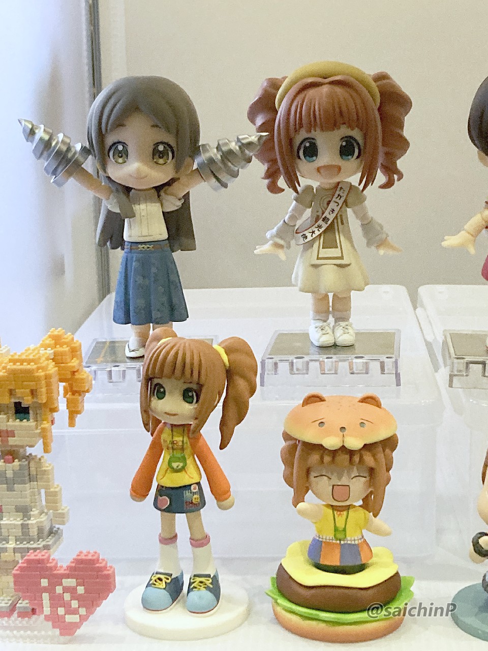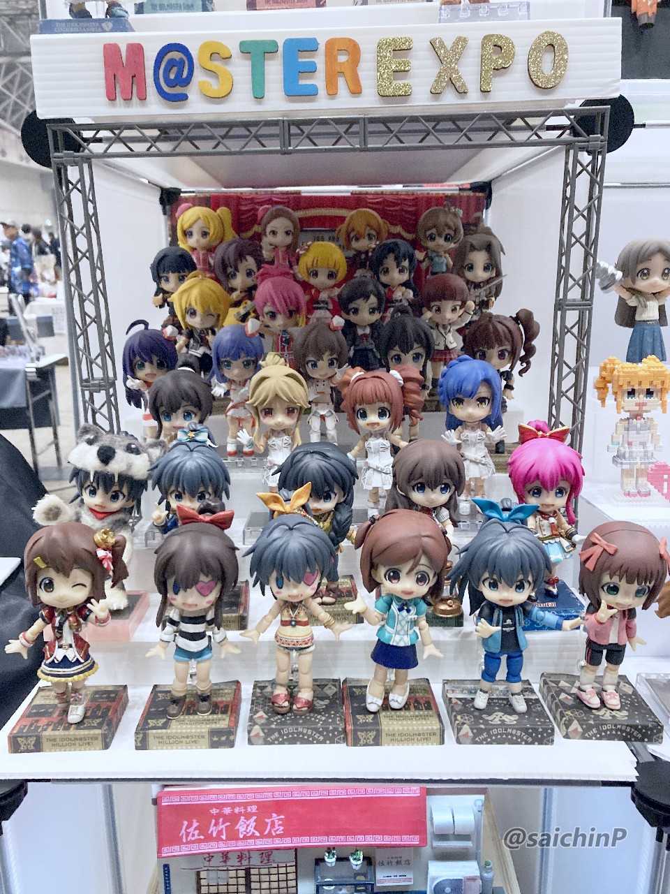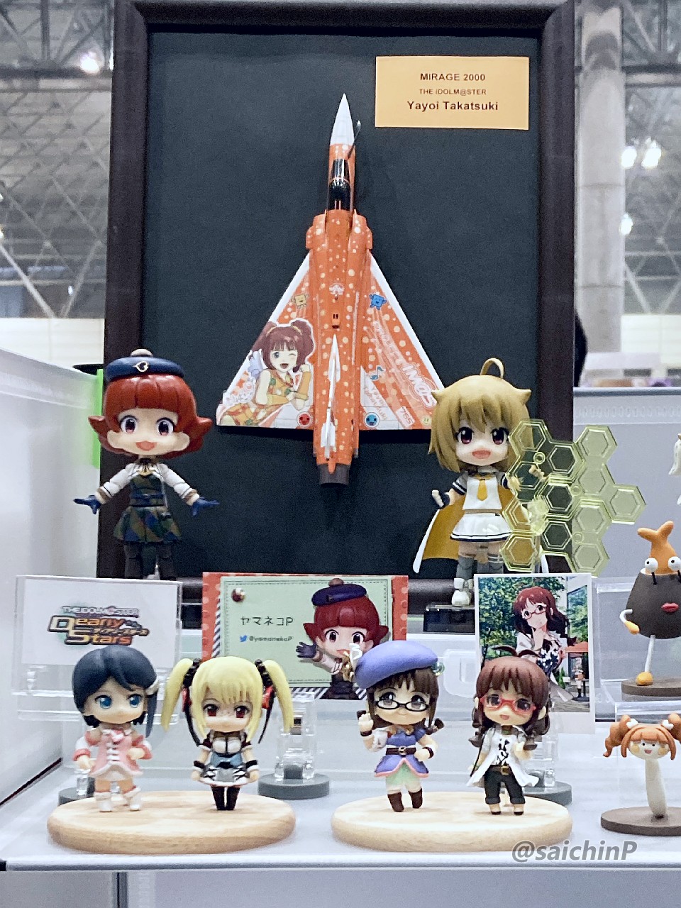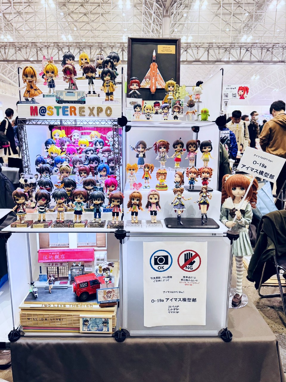 14日のDay1はサークル参加で模型やフィギュアの展示。 15日のDay2は一般参加です。 イベントの詳細は公式をチェックしてください。 サークル名 『アイマス模型部』 卓番 Day1 O-19a さいちんP(私)と たかぼうP(@ntakabou)更にゲストとして ヤマネコP(@yamanekoP)に参加していただきました。 これはサークルカットとして提出した画像です。 カタログでの使われ方を見ると、視認性を考えて写真の数を少なくしてサイズを大きく、文字ももっと大きいほうが良かったなと反省。 当日の卓の様子です。(※この写真のみ、たかぼうP撮影、許可済) 向かって左半分がたかぼうP、右半分が私とゲストのヤマネコPとなっています。 WFでの展示の経験から机ベタ置きは論外、見学者が屈み込まないでも見えるように高さを意識しています。 左上段、たかぼうPのミリオンライブ以外のフィギュア達。 SideMは立体化が少ないので注目されていました。 左中段、たかぼうPのミリオンライブのフィギュア多数。 満員電車かという密度ですが、公式イベントでの展示機会がまたあるという保証がないのでありったけ持ち込みたい気持ちはわかります。 左下段、たかぼうPの1/24スケール佐竹飯店ジオラマ。 こういうテーマ性のある作品は再現度の高さもあってかなり好評でした。 上段右、さいちんPのアイマス機やよいミラージュ2000とミリオンライブマスコット達。 これはゲスト追加前の状態。 ゲストのヤマネコPの展示は茜ちゃんとマイティセーラー翼、律子2種とアイマスDSの絵理と当日が誕生日だったサイネリア。 このDSの2人は「作者巡回済み」の実績を解除しました、やったね! 右中段はさいちんPのフィギュア色々です、やよいおり多め。 たかつき観光大使のやよいちゃんは途中で衣装を変更しています。 学マスの千奈ちゃんはこのイベント用の新作ですが、皆さん「元気な挨拶」で笑ってくれたのでヨシ! 最後に看板娘のやよいちゃんドール。 外に連れ出すことは稀なのですがせっかくの機会なので。 個人の展示にどれくらい人が来るのか未知数でしたが、WFとは違って来ているお客さんが全員アイマス好きとなるのでWFでの展示よりも、より見てもらえたという手応えがあって嬉しかったです。 2007年にやよいのフィギュアを作ってニコニコにアップしてからアイマス模型部を自称して色々とアイマス関係を作り続けてきて17年、ついに公式の場で作品を展示できて感無量です。 展示を見てくれた人、声をかけてくれたり名刺を交換してくれた人、差し入れまでしてくれた人、そしてスタッフの皆様に感謝です。 15日のDay2は一般参加で律子のとミリオンライブのライブステージに参加してその合間に各種展示やイベントを楽しみました。 普段よく行く2Daysのライブよりも更に充実した密度の高い2日間でした。 最後に今回私が展示した作品の個別の記事リンクをまとめておきます。 1 やよい誕生日なのでミラージュ 2000を作りました 2 ミリオンライブのコムギちゃん 3 WF2023冬 ミリシタ でんでんむすくん完成 4 8月41日なのでやよいもやしを作った 5 WF2020冬 ミリシタ チュパカブラ完成 6 学マスの倉本千奈ちゃんがかわいいので作りました 7 やよい誕生日なのでたかつき観光大使を作りました 7 やよい誕生日なので新衣装たかつき観光大使を作りました 8 キューポッシュで木下ひなたちゃんを作りました 8 りんご大使ひなたちゃんがめでたいのでたすきを作った 9 キューポッシュで春日未来ちゃんを作りました 10 キューポッシュで中谷育ちゃんを作りました 11 ミリシタアートコンテストに参加してみた 12 ピンキーでやよいを作ってみる(ニコニコ動画マイリスト) 12 やよいピンキーまとめ画像 13 WF2024夏 告知【4-25-06】 14 WF2024冬 告知【1-15-08】 15 WF2023夏 告知【4-10-02】 16 8月41日なのでやよいぬいフィギュアのアナザーカラーを作った 17 WF2017夏の告知です(やよいキャンプウェア) 17 8月41日なのでSHSやよいを作った 18 https://x.com/saichinP/status/950325369843810305 (過去のツイート) 19 やよい誕生日なのでルミエール・パピヨン+を作りました 20 伊織誕生日なのでルミエール・パピヨン+を作りました 関連 アイマスエキスポにサークル参加します【Day1 O-19a】 律子オンリーとかちょっと行ってきた WF2024夏 参加しました